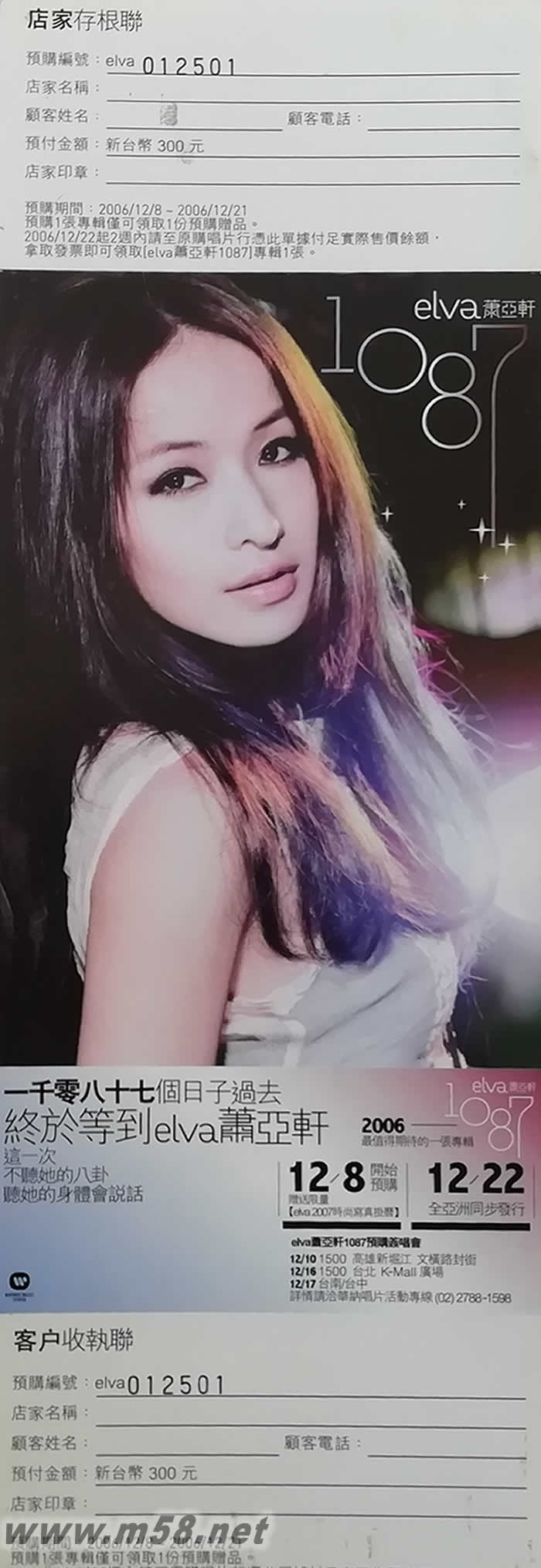 1087臺灣版預購單(m58.net) 預購單尺寸:25.5*8.5CM 厚紙板夾寄