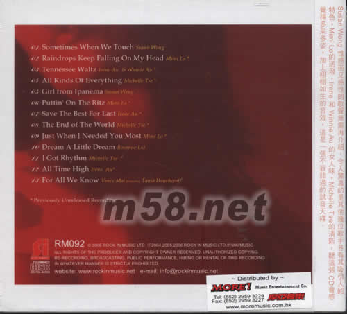 1.SOMETIMES WHEN WE TOUCH --SUSAN WONG 2.RAINDROPS KEEP FALLING ON MY HEAD --MIMI LO 3.TENNESSEE WALTZ --IRENE AU &WINNIE AU 4.ALL KINDS OF EVERYTHING --MICHELLE TSC 5.GIRL FROM IPANEMA SUSAN WONG 6.PUTTIN 'ON THE RITZ --MIMI LO 7.SAVE THE BEST FOR LAST --IRENE AU 8.THE END OF THE WORLD -MICHELLE TSC 9.JUST WHEN I NEEDED YOU MOST --MIMI LO 10.DREAM A LITTLE DREAM --ROSANNE LUI 11.I GOT RHYTHM --MICHELLE TSC 12.ALL TIME HIGH --IRENE AU 13.FOR ALL WE KNOW--VINCE MAI FEATURING TANIA HANCHEROFF