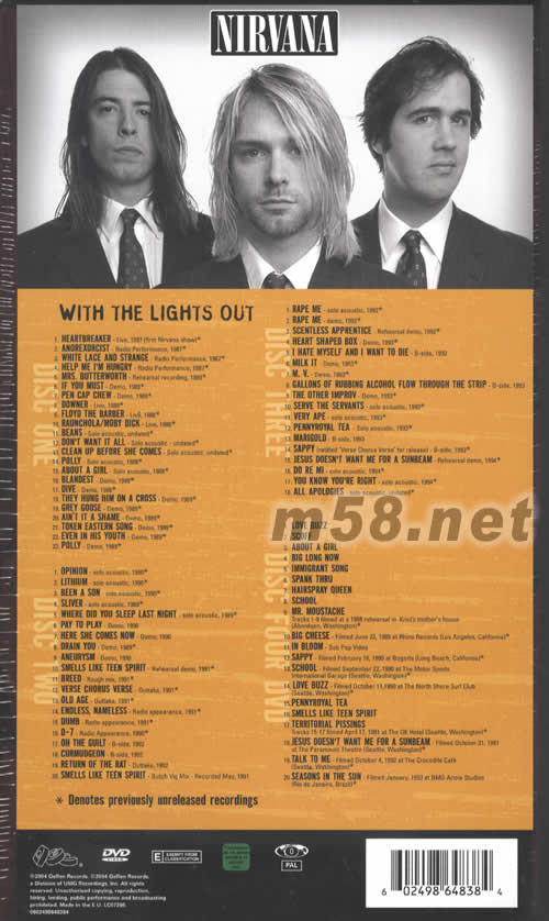價(jià)格為估,以實(shí)到貨為準(zhǔn)! WITH THE LIGHTS OUT套裝(m58.net) 請(qǐng)點(diǎn)看產(chǎn)品正、背面大圖 3CD+DVD+寫(xiě)真集 81 Tracks Including 68 Previously Unreleased Recordings Never Before Seen Footage 60 Page Full Color Booklet 讓全球歌迷期待已久的Nirvana作品《With The Lights Out》,里面一共收錄了61首未曾發(fā)表過(guò)的歌曲,這套作品集一共有4張CD,里面總共收錄81首歌曲,其中有三張是CD,另外一張則是DVD.在這些歌曲中,大部分是未曾發(fā)表過(guò)的作品,而其中以他們排練、剪輯掉的片段、Kurt Corban在家里完成Demo帶為,而其中DVD的部分也有收錄該團(tuán)在自家中拍攝的影片、生活剪影、采排的片段等等,其中還有20段他們的表演片段。另外,隨著CD、DVD,這套CD盒中還附送一本厚達(dá)60頁(yè)的小冊(cè)子,另外產(chǎn)品封面包裝是不銹鋼板。極為精致。 至于這套CD盒的標(biāo)題《With The Lights Out》其實(shí)是從他們的暢銷(xiāo)單曲Smells Like Teen Spirit中截選出來(lái)的。