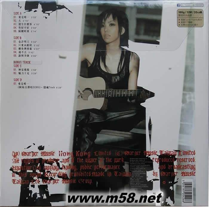 Side A (黑膠唱片 1) 1. 愛是唯一 3’55” 2. 火 3’15” 3. 發生什么事 4’19” 4. 你好不好 3’50” 5. 關鍵時刻 5’14” Side B (黑膠唱片 2) 1. 也許明天 5’02” 2. 只愛高跟鞋 3’15” 3. 娜魯灣情歌 4’02” 4. 過不去 3’42” 5. 誰與爭鋒 4’00” Side C Bonus Track (45 RPM) (黑膠唱片 3) 1. 神采飛揚 3’58” 2. 魅力十足 3'28" Side D Hidden Track (45 RPM) (黑膠唱片 4) 1. 愛是唯一 (阿妹自彈唱DEMO) - 隱藏Track 6’26”