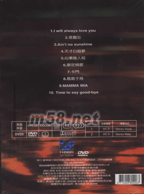 01. I will always love you 02. 意難忘 03. Ain't no sunshine 04. 天才白癡夢 05. 心事誰人知 06. 康定情歌 07. 卡門 08. 鳳凰于飛 09. MAMMA MIA 10. Time to say good-bye