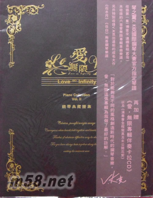 華人流行演奏的傳奇,新鋼琴演奏風格的代表,亞洲鋼琴小天王《V.K克》席卷全球暢銷鋼琴專輯《愛‧無限》鋼琴典藏譜集第二冊熱烈上市。不但完整收錄《愛‧無限》專輯六首精華歌曲,更附上《V.K克》未出道前的創作私藏樂譜《花水月》、《自白》,滿足歌迷粉絲們的期待。另外值得一提的是,V.K聽取廣大歌迷朋友的建議,將其中幾首曲風澎湃,背景音樂豐富的樂曲特別節錄出卡拉版本,如《琴之翼》、《地球之淚》、《亞特蘭提斯之戀》共七首樂團伴奏曲目完整收錄,讓許多會彈鋼琴的朋友們過足癮,也能一嘗舞臺上的感覺,讓自己變成臺上的明星,有大型管弦樂團為自己伴奏,不但是演奏專輯的少數創舉,由V.K的演奏曲來演奏更能發揮其豐富的效果。