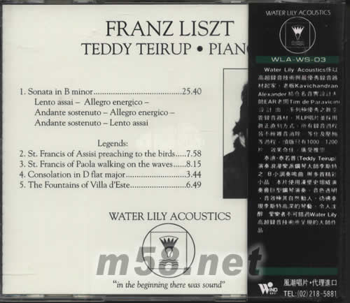 價(jià)格為估,以實(shí)到貨為準(zhǔn)! 李斯特鋼琴作品集(m58.net) WATER LILY ACOUSTICS 是以高超錄音技術(shù)與最優(yōu)秀錄音器材起家,老板KAVICHANDRAN ALEXANDER結(jié)合名音響高駐地大師EAR老關(guān)TIM DE PARAVICINI設(shè)計(jì)出一系列極優(yōu)秀之真空管錄音器材,其LP唱片并采用真正直刻方式,所有錄音過(guò)程皆不經(jīng)雜音消除、等化及壓縮等過(guò)程,頭自版只有1000-1200片,效果奇佳,廣受推崇 泰迪·泰若普(TEDDY TEIRUP)演求全責(zé)備浪漫樂(lè)派鋼琴大師李斯特之B小調(diào)奏鳴曲與多首精彩小品。本片使用漲堡史坦威演奏會(huì)巨型鋼琴演奏,音色透明,音效極其自然動(dòng)人,彷佛重現(xiàn)李斯特高深的琴藝,令人沈醉。愛(ài)樂(lè)者不可錯(cuò)過(guò)WATER LILY 高超錄音技術(shù)所呈現(xiàn)的大師作品。