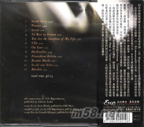 Ulli的獨奏吉他技法很難歸類,所以本店將他的專輯放在新世紀音樂區,這種樂風說不定會愈來愈流行。據唱片公司說,由于臺灣樂友們熱切的回應,大師目前似乎正努力排出空檔,期盼與本地樂迷們作第二回合的接觸呢。