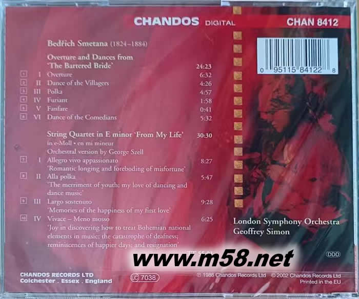 SMETANA The Bartered Bride 史美塔那:待嫁新娘(m58.net) 史美塔那:<待嫁新娘>序曲&舞曲/ 我的一生(George Szell改編管弦樂版) Geoffrey Simon 指揮 倫敦交響管弦團) 英國留聲機大獎名盤 音樂質感一流;音色溫暖通透 錄音效果超卓,音樂表現力令人贊賞 英國原裝進口