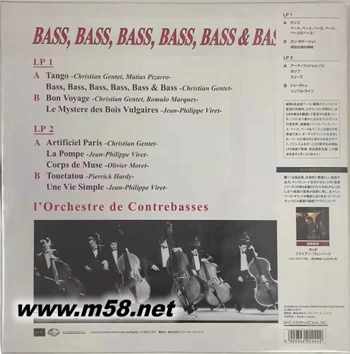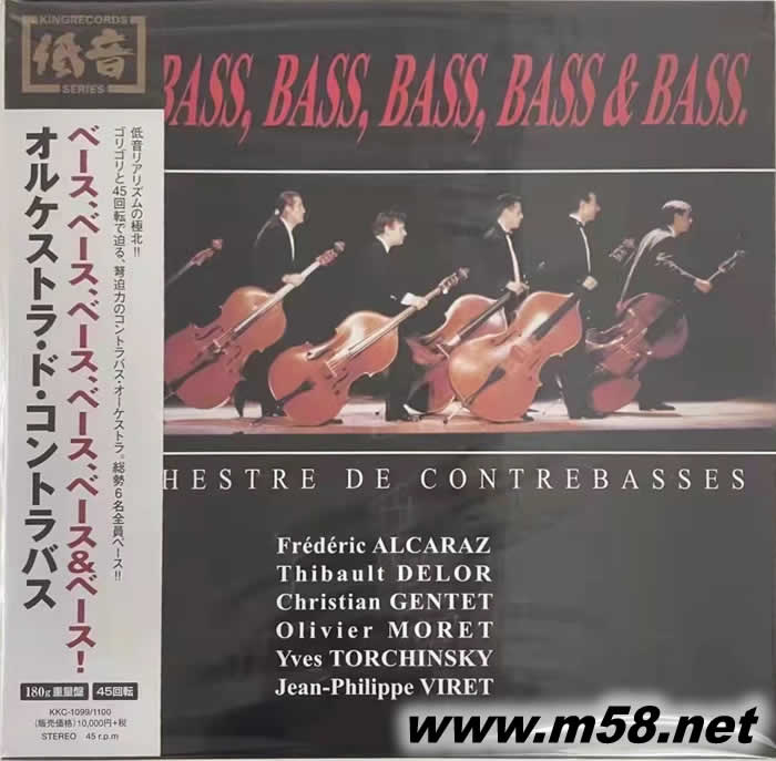 I'ORCHESTRE DE CONTREBASSES BASS,BASS,BASS,BASS,BASS & BASS 雙黑膠 日本版(m58.net) 在低音領(lǐng)域錄音有著超高水準(zhǔn)的KING RECORDS公司錄音的低音系列,來(lái)自法國(guó)的6位低音提琴高手,以精湛的技巧與默契的配合演奏多首經(jīng)典作品:探戈/貝斯,貝斯,貝斯…/一路順風(fēng)等,45轉(zhuǎn)雙黑膠限量版。