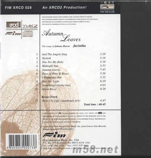 秋葉AUTUMN LEAVES XRCD(m58.net) 一聽便知道這張睥睥一切其他制式版本,是最能表現出[擇仙花]的迷人神韻。 Jacintha[擇仙花],1999年歌聲一鳴驚人,被發燒音樂界公認為“全年最佳女聲“,而此碟更以迷人的心情全新演繹Johnny Mercer的作品歌曲,人聲的圓潤、清晰和厚度非同往常,鋼琴的通透,倍大提琴的彈跳力也是天碟級的水準。可以說是一張極佳的人聲天碟。 這位讓人目瞪口呆的女歌手來自新加坡,母親是中國人,而父親則是印度人,血液中有著天賦的歌唱才華。Jacintha從小習唱,并學習鋼琴和吉他等樂器。8O年代涉足爵士樂界,并開始在美國各種音樂節上嶄露頭角。她的聲音酷似大名鼎鼎的前輩女歌手雪莉·荷恩,嗓音慵懶、溫暖又不失明晰甜美,極檀長演唱那種慢得似乎要讓的間停止的動人歌曲,并在每個拉長的音符中賦予聽者直入心田的深沉顫動。