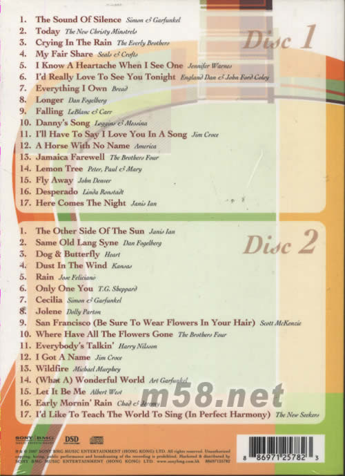 GOOD FOLK DAYS(民謠的好時光)(m58.net) 回憶總是甜蜜的,就讓時光倒流數(shù)十年,重回民歌的光輝歲月,讓我們重拾往昔的浪漫。Good Folk Days雙CD集收錄了34首經(jīng)典民歌,讓歌迷一次過重溫最好時光。包括Simon & Garfunkel/The Sound Of Silence、Janis Ian/The Other Side Of The Sun、The Everly Brothers/Crying In the Rain、Dan Fogelberg/Same Old Lang Syne等等。
