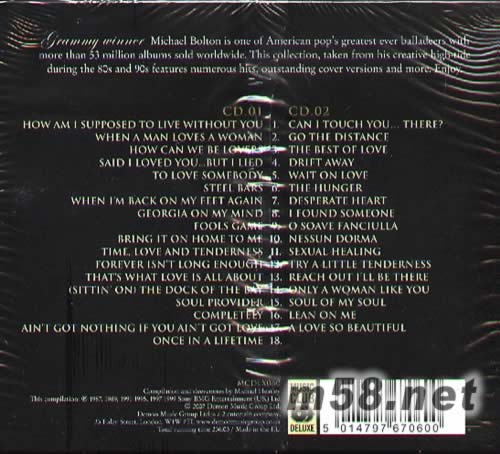 The Very Best Of Michael Bolton 精選專輯(m58.net) 格林美大獎得主,全球唱片銷量高達五千三百萬張之美國流行歌手Michael Bolton 的一張雙碟精選專輯,收錄35首Michael Bolton 經(jīng)典情歌代表作,首首熱門作品,超值巨獻,不容錯過!