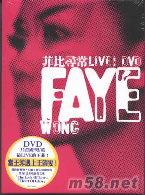 菲比尋常Faye Wong Live DVD(m58.net) 請點看產品正、背面大圖 橫跨新藝寶/EMI/新力時期30首及時首從未收錄英文歌 [THE LOOK OF LOVE] [HEART OF GLASS] 亞洲天后王菲2003年壓軸演唱會,為你呈獻《王菲菲比尋常Faye Wong Live》DVD的聲色藝的阿菲! 一連八晚(2003年12月20日至27日)在紅館的舞臺上,一向帶領潮流的阿菲,率先在離地30呎的凌空舞臺上揭開個唱序幕,配襯一身全白羽毛裝扮,再加上藍白夸張的眼影化妝,締造「菲比尋?!沟母杏X。阿菲表示,她希望與觀眾以「音溝(音樂溝通)」溝通,全晚以歌會友,沒有冷場,還和觀眾握手,表現親民。 設計師為配合阿菲個唱主題「菲比尋常」,為她設計多套含錯體感覺的服裝,其演唱會在服裝上亦費盡心思,動用超過七位數字置裝。阿菲除了換了10多套衫,還會穿上一對「菲」賣品的十吋高跟鞋及一套在1929至1932年設計的黑色古董衫登場,凸顯她高人一等的天后級數。而今次阿菲更獻唱由早期新藝寶、EMI至現時新力音樂時期多首經典英語、國語及粵語舊歌,如「冷戰」、「誓言」、「暗涌」等,以及兩首從未收錄的英文歌曲「Heart of Glass」和「The Look of Love」,相信歌迷必定大飽耳福。