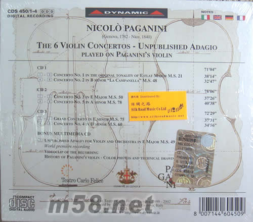 CD1 1-3 concerto NO.1 in the original tonality of E-flat majorM.S.21 4-6 concerto NO.2 in Bminor"la campanella"M.S.48 CD2 1-3 concerto NO.3 in E MajorM.S.50 4-6 concerto NO.5 in A minor M.S.78 CD3 1-3 grand concerto in E minor M.S.75 4-6 concerto NO.4.in D minor M.S.60