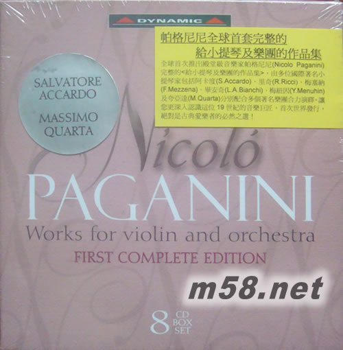 帕格尼尼 全球首套 完整的給小提琴及樂團的作品集 8CD套裝(m58.net) 殿堂級音樂家帕格尼尼(Nicolo Paganini)出生自意大利的熱那亞(Genova),天賦他卓越的音樂才能,自小便得到父親的悉心栽培,結果不負所望,11歲便展開他的音樂生涯,於樂壇嶄露頭角,16歲創作出其絕世作品[24首隨想曲]而一鳴驚人,令他的事業大躍進,成為頂尖的作曲家。全球首次推出帕格尼尼完整的<給小提琴及樂團的作品集>,合共收錄了27首旋律優美、完美工整的作品包括[降E大調第1小提琴協奏曲M.S.21(Violin Concerto No.1 in E flat Major M.S.21)]、[E小調大協奏曲M.S.75(Grand Concerto in E minor M.S.75)]、[女妖之舞M.S.19(La Streghe M.S.19)]、[馬麗亞.露易薩的奏鳴曲(Sonata Maria Luisa)]、[塔朗泰拉舞曲M.S.76(Tarantella M.S.76)]、[中提琴大奏鳴曲M.S.70(Sonata per la Grand Viola M.S.70)]及[拿破侖奏鳴曲M.S.5(Sonata Napoleon)]等,由多位國際著名小提琴家包括阿卡度(Salvatore Accardo)、里奇(Ruggiero Ricci)、梅塞納(Franco Mezzena)、畢安奇(Luigi Alberto Bianchi)、梅紐因(Yehudi Menuhin)及夸亞達(Massimo Quarta)分別配合多個著名樂團合力演繹。讓您更深入認識這位19世紀的音樂巨匠,首次世界發行,絕對是古典愛樂者的必然之選!