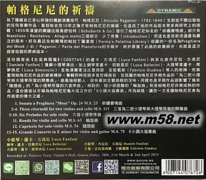 帕格尼尼 重新發(fā)現(xiàn) Paganini Rediscovered(m58.net) Luca Fanfoni (violin)、Luca Ballerini (piano)、 Daniele Fanfoni (violin)、Luca Simoncini (cello)、 Fabrizio Giudice (guitar) 殿堂級音樂家帕格尼尼(Nicolo Paganini)出生自意大利的熱那亞(Genova),天賦他卓越的音樂才能,自小便得到父親的悉心栽培,結(jié)果不負所望,11歲便展開他的音樂生涯,於樂壇嶄露頭角,16歲創(chuàng)作出其絕世作品[24首隨想曲]而一鳴驚人,令他的事業(yè)大躍進,成為頂尖的作曲家。 國際知名的小提琴演奏家路卡.芬霍尼(Luca Fanfoni)肆業(yè)於"米蘭威爾第音樂學(xué)院(Giuseppe Verdi Conservatory in Milan)",師承吉捷諾.馬斯特里(Gigino Maestri),曾獲多個國際比賽獎項。芬霍尼在2015年4月於熱那亞(Genova)的多利亞宮小提琴廳(Palazzo Tursi, Violin’s Hall)內(nèi)錄音,伙拍鋼琴家盧卡.巴萊里尼(Luca Ballerini)、小提琴家丹尼爾.芬霍尼(Daniele Fanfoni)、大提琴家盧卡·西蒙奇尼(Luca Simoncini)與及結(jié)他演奏家法布里奇奧.祖迪錫 (Fabrizio Giudice),帶來帕格尼尼以下的作品選: 世界首次以CD載體發(fā)行,包括給小提琴及鋼琴連同重新發(fā)現(xiàn)的序曲版本 1.羅西尼歌劇"摩西"主題變奏曲-摩西的祈禱,作品24,MS23(Sonata a Preghiera : Introduction and Variations on "Dal tuo stellato soglio" from Rossini's Mose in Egitto,Op.24,MS23)