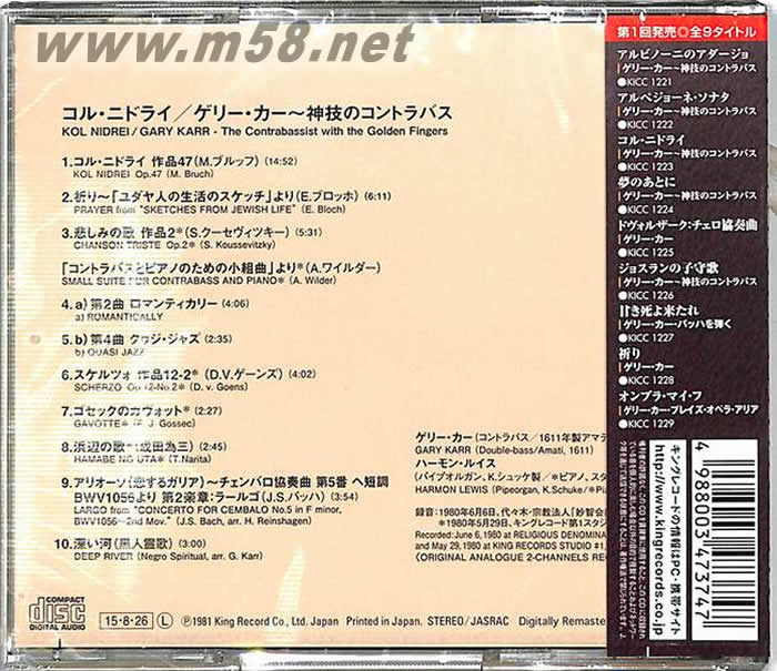 1. KOL NIDREI OP.47 / Gary Karr 2. PRAYER FROM 'SKETCHES FROM JEWISH LIFE' / Gary Karr 3. CHANSON TRISTE OP.2 / Gary Karr 4. SMALL SUITE FOR CONTRABASS AND PIANO A) 2 ROMANTICALLY / Gary Karr 5. SMALL SUITE FOR CONTRABASS AND PIANO B) 4 QUASI JAZZ / Gary Karr 6. SCHERZO OP.12-NO.2 / Gary Karr 7. GAVOTTE / Gary Karr 8. HAMABE NO UTA / Gary Karr 9. LARGO FROM 'CONCERTO FOR CEMBALO NO.5 IN F MINOR. BWV1056-2ND MOV.' / Gary Karr 10. DEEP RIVER / Gary Karr