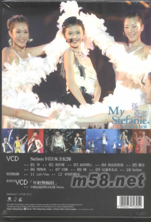 STEFANIE卡拉OK全記錄 1、奔 2、我的愛 3、祝你開心 4、我也很想他 5、聽見 6、慢慢來 7、同類 8、種 9、反過來走走 10、STEFANIE 特別收錄 11、LET‘S VINO 12、未知的精彩 BONUS VCD 年輕無極限 中國巡回演唱全記錄30MINS