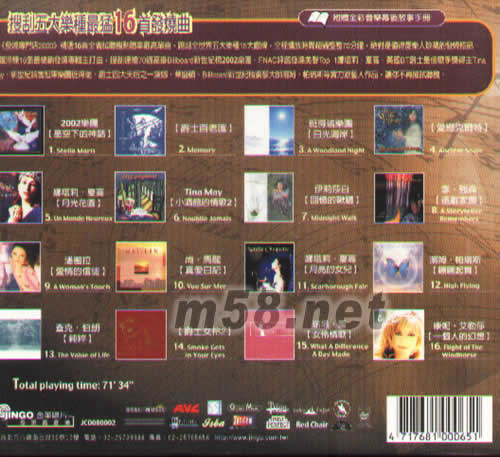 01. Stella Maris 師蒂拉 [蟬聯(lián)Billboard超強(qiáng)70周實(shí)力派2002樂團(tuán)最新主打曲] 02. Memory 回憶 [百老匯破紀(jì)錄連演7485場(chǎng)音樂劇<貓>主題曲] 03. A Woodland Night 森林中的一夜 [新世紀(jì)銷售冠軍班得瑞樂團(tuán)重編鋼琴經(jīng)典代表曲] 04. Ancient Souls 古老的靈魂 [克爾特史上最年輕女聲佳百莉融合葛利果圣歌成名曲] 05. Un Monde Heureux 快樂世界 [2000年臺(tái)北國際城市藝術(shù)節(jié)壓軸藝人娜塔莉電視廣告曲] 06. Noublie Jamais 永遠(yuǎn)別忘記 [大英國協(xié)BT爵士大獎(jiǎng)最佳歌手Tina May駐場(chǎng)招牌曲] 07. Midnight Walk 午夜漫步 [南加大鋼琴碩士依莉莎白榮獲國際音樂節(jié)首獎(jiǎng)創(chuàng)作曲] 08. A Storyteller Remembers 雪洛基長(zhǎng)老 [史上氣勢(shì)最磅礴交響曲+印地安吟唱民族大和解震撼曲] 09. A Woman's Touch 一夜情 [克爾特美聲潘蜜拉放浪吉普賽風(fēng)情最受爭(zhēng)議話題曲] 10. Vue Sur Mer 看海 [比利時(shí)鋼琴巨匠尚.馬龍奔洩男人柔情高潮曲] 11. Scarborough Fair 畢業(yè)生 [娜塔莉全球正宗首唱電影[畢業(yè)生]美聲版挑戰(zhàn)曲] 12. High Flying 越飛越高 [Billboard鋼琴大師湯姆.帕瑞斯再登顛峰攻頂曲] 13. The Value of Life 無價(jià) [查克.伯朗精煉20年創(chuàng)作生涯首選雋永傳世曲] 14. Smoke Gets in Your Eyes 你那迷蒙的眼神 [<你是我今生的新娘>、<直到永遠(yuǎn)>黛娜華盛頓原唱曲] 15. What a Difference a Day Made 一天的變化有多少 [電影<重慶森林>、<羅拉快跑>主題曲] 16. Flight of the Windhorse 天馬行空 [Billboard成人榜Top 20小提琴才女康妮新作首發(fā)曲]