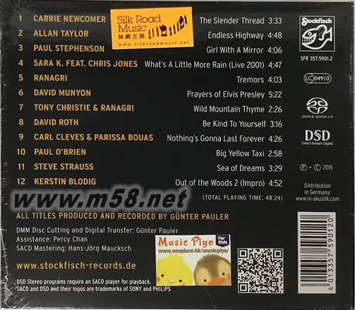 1. 嘉莉.紐坎瑪(Carrie Newcomer):細(xì)長的線 (The Slender Thread) 2. 阿倫.泰勒(Allan Taylor):無盡的公路(Endless Highway) 3. 保羅.斯蒂芬森(Paul Stephenson):有鏡子的女孩(Girl With A Mirror) 4. 莎拉.K與克里斯.鐘斯(Sara.K FEAT Chirs Jones):多點雨會是怎樣(What’s A Little More Rain) (Live 2001) 5. 瓦納格(Ranagri):顫抖(Tremors) 6. 大衛(wèi).繆雍(David Munyon):為“貓王”皮禮士利禱告(Prayers Of Elvis Presley) 7. 托尼.克莉斯蒂與瓦納格(Tony Christie & Ranagri):山野中的麝香草Wild Mountain Thyme 8. 大衛(wèi).羅斯(David Roth):善待自己(Be Kind To Yourself) 9. 卡爾.克利夫斯及帕妮莎.布雅絲(Carl Cleves & Parissa Bouas):沒有什么是保持至永遠(yuǎn)的(Nothing’s Gonna Last Forever 10. 保羅.奧布林(Paul O’Brien):黃色出租車(Big Yellow Taxi)] 11. 斯蒂芬.斯特勞斯(Steve Strauss):夢之海(Sea of Dreams) 12. 克絲汀.布魯?shù)?Kerstin Blodig):走出困境(Out of the Woods)