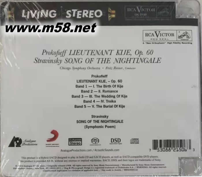 ★ 由 RCA 傳奇錄音大師 Lewis Layton 錄製,Analogue Productions 以 三聲道/立體聲 SACD 重新發(fā)行! 普羅高菲夫的「基杰中尉」本來(lái)是為電影所寫的配樂(lè),后來(lái)由普羅高菲夫親自從中選出五曲改寫成交響組曲。故事充滿諷刺意味,音樂(lè)節(jié)奏簡(jiǎn)單輕快,洋溢著濃濃的俄羅斯風(fēng)味,其中的「雪橇」更是樂(lè)迷所熟知的曲目。「夜鶯之歌」是史特拉汶斯基為芭蕾舞劇所譜寫的配樂(lè),充滿著東方的異國(guó)風(fēng)味,引人無(wú)限遐想。這兩首樂(lè)曲在指揮大師萊納與芝加哥交響樂(lè)團(tuán)的演奏下,呈現(xiàn)出粗獷厚實(shí)的質(zhì)感,極為生動(dòng)的描繪出俄羅斯的音樂(lè)畫面,實(shí)為此兩首曲目的最佳詮釋版本。 RCA 製作人 Richard Mohr 與錄音師 Lewis Layton 兩人聯(lián)手,加上 Sterling Sound 的 Ryan Smith 精心后製,使得這份四十多年前的錄音就有著近乎完美、無(wú)比透明的錄音效果。