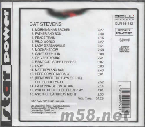 1、MORNING HAS BROKEN 2、FATHER AND SON 3、PEACE TRAIN 4、WILD WROLD 5、LADY D ARBANVILLE 6、MOONSHADOW 7、CAN‘T KEEP IT IN 8、FIRST CUT IS THE DEEPEST 10、LADY 11、MATTHEW AND SON 12、HERE COMES MY BABY 13、(REMEMBER THE DAYS OF THE )OLD SCHOOLYARD 14、I’M GONA GET ME A GUN 15、WHERE DO THE CHILDREN PLAY 16、ANOTHER SATURDAY NIGHT
