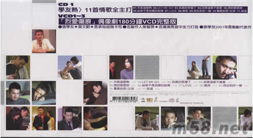 CD1 學友熱>11首情歌全主打 01. 天氣這么熱 02. LET ME GO 03. 我真的受傷了 04. 如果這都不算愛 05. 想的都是她 06. 結束不是我要的結果 07. LOVE 08. 算命 09. 我也和你一樣 10. 看開些吧!女孩 11. 放逐 VCD1-3 [烈愛傷痕]偶像劇180分鐘VCD完整版 *張學友+莫文蔚+言承旭超強卡司 *名制作人柴智屏+名導演馬宜中全力打造 *張學友2001年音樂劇代表作