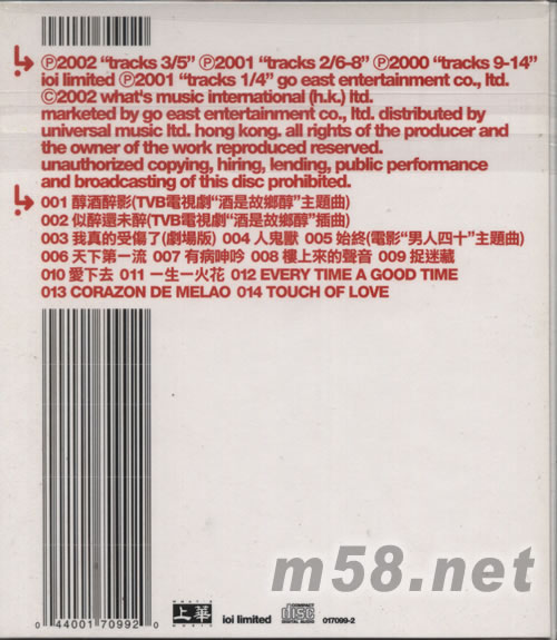 01.醇酒醉影 (電視劇<酒是故鄉(xiāng)醇>主題曲) - 張學(xué)友/陳潔儀 02.似醉還未醉 (電視劇<酒是故鄉(xiāng)醇>插曲) 03.我真的受傷了 (劇場版) 04.人鬼獸 05.始終 (全新歌曲及電影<男人四十>主題曲) 06.天下第一流 07.有病呻吟 (四臺(tái)聯(lián)頒歌曲大獎(jiǎng)) 08.樓上來的聲音 09.捉迷藏 10.愛下去 11.一生一火花 12.Every Time A Good Time 13.Corazon de melao 14.Touch of love