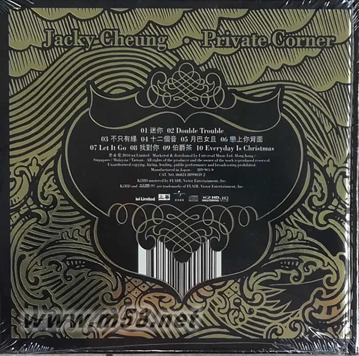 Private Corner 私人角落 K2HD-HQCD(m58.net) K2 HD MASTERING-HQCD 超高解析 音域無限-日本Victor Entertainment 【K2HD】制式音效 使母版的音量提升至極限 日本MEMORY-TECH【HQCD】壓碟技術 This is my 「Private Corner」, come join me and you'll see...Jacky Cheung 「 Private Corner 」 是一種享受 是一種品味 更是一種上癮的滋味 Private choices: 迷你 十二個音 Double Trouble 不只有緣 戀上你背面 2010年「歌神」張學友王者歸來,推出震撼樂壇重量級全新力作《Private Corner》!自從《Life is Like a Dream》(2004)面世以來,樂迷期盼他下一張粵語專輯已逾五年之久。今日再發新專輯,學友已不滿足于流行曲演唱,這幾年間他的唱功進化練成前所未聞的新聲音,給華語樂壇帶來驚喜。學友如醇酒的歌喉總令人陶醉神往,他的聲線跟新專輯內的爵士曲風更是配合得天衣無縫。《Private Corner》是為高品味的樂迷而設的精心制作,監制杜自持特別用上全部真實樂器演奏以確保最佳音色。