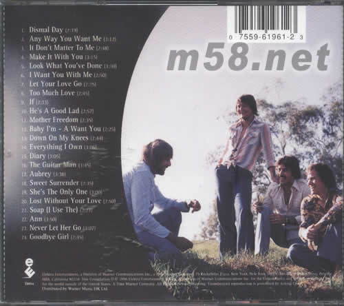 1、DISMAL DAY 2、ANY WAY YOU WANT 3、IT DON‘T MATTER TO ME 4、MAKE IT WITH YOU 5、LOOK WHAT YOU’VE DONE 6、I WANT YOU WITH ME 7、LET YOUR LOVE GO 8、TOO MUCH LOVE 9、IF 10、HE‘S A GOOD LAD 11、MOTHER FREEDOM 12、BABY I’M AWANT YOU 13、DOWN ON MY KNES 14、EVERYTHING I OWN 15、DIARY 16、THE GUITAR MAN 17、AUBREY 18、SWEET SURRENDER 19、SHE‘S THE ONLY ONE 20、LOST WITHOUT YOUR LOVE 21、SOAP(I USE THE) 22、ANN 23、NEVER LET HER GO 24、GOODBYE GIRL