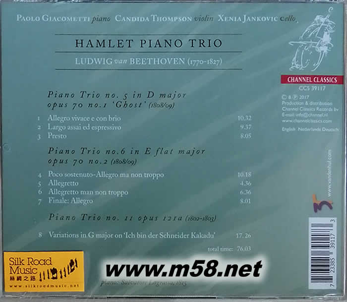 貝多芬 [鋼琴三重奏作品編70及121] Beethoven [Piano Trios Opus 70 & 121](m58.net) Paolo Giacometti (piano)、 Candida Thompson (violin)、Xenia Jankovic (cello) 1. 由三位國際知名的世界級演奏家包括意大利鋼琴家保羅.詹高馬蒂(Paolo Giacometti),俄羅斯的小提琴家坎迪達.湯普森(Candida Thompson)和大提琴家森妮雅.揚科維奇(Xenia Jankovic)組成,他們默契良好,琴技高超優美,在國際古典樂壇奠下崇高地位。 2. 樂隊繼演奏門德爾松的三重奏作品獲得樂評人和樂迷一致好評后,新專輯是演奏貝多芬開始時備受爭議但后來被人完全接受的鋼琴三重奏作品其中兩首最為人津津樂道的作品編號70和121(Piano Trio No. 5 in D major, Op. 70 No. 1 'The Ghost' & Piano Trio No. 6 in E flat major, Op. 70 No. 2 and Variations in G major on Wenzel Muller's ich bin der Schneider Kakadu, Op. 121a),這些作品是對演奏者作出最嚴格的考驗。 3. 詹高馬蒂那流暢鏗鏘,如大珠小珠落玉盤的琴音由湯普森抑揚有致,順滑如絲的小提琴演奏,配合揚科維奇溫婉中帶著剛勁的大提琴優雅地襯托著,將貝多芬的名作以極誘人的姿態呈現。