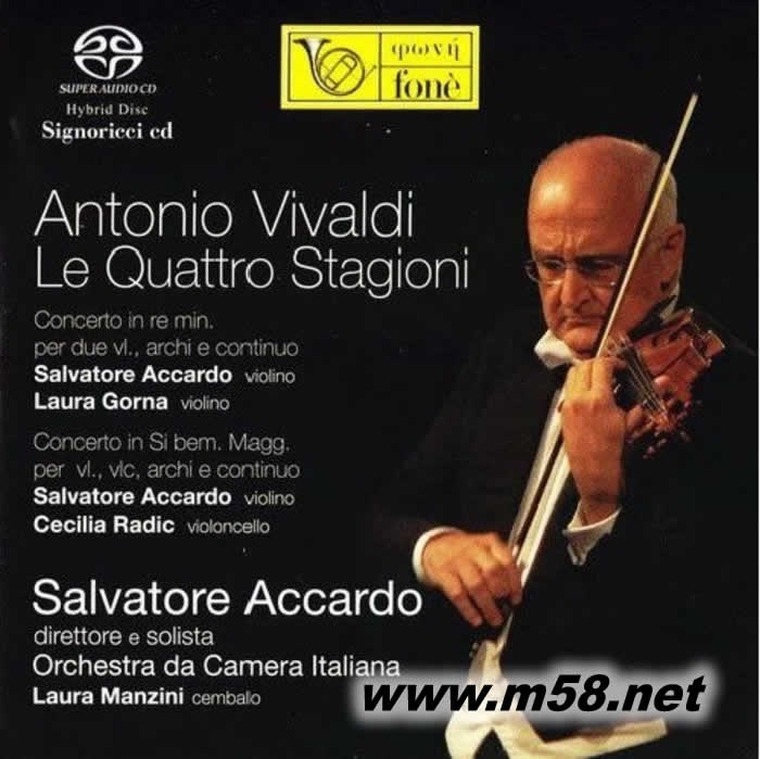 阿卡多 - 維瓦爾第:四季 Four Seasons SACD(m58.net) Salvatore Accardo (小提琴) Laura Manzini (鋼琴) Orchestra da Camera Italiana 意大利小提琴一代宗師阿卡多(Salvatore Accardo)擁有超然的樂壇地位,出神入化的琴技往往令人聽得熱血沸騰渾身充滿動感,仿如人琴合一般的演奏絕對無人能及,技術銳不可擋。17-18世紀叱吒古典樂界的風云人物之一的維瓦爾第(Antonio Vivaldi)出身自音樂世家,自小跟隨父親學習小提琴,是巴洛克鼎盛時期意大利著名的作曲家、小提琴家和音樂教育家,而首本名曲[四季(The Four Seasons)]更瘋魔全球同時亦奠定他在國際樂壇上的崇高地位及影響力,亦被譽為”協奏曲之父”。縱然市面上已有很多不同的[四季]錄音版本,但這次由意大利極負盛名的發燒品牌<豐力(Fone)>著名錄音師里奇(Giulio Cesare Ricci)親自監製,由阿卡多伙拍"意大利室樂團(Orchestra da Camera Italiana)"與及杜西馬琴(羽管鍵琴)演奏家羅娜.曼仙妮(Laura Manzini)帶來前所未有、最完美無瑕的版本。另外阿卡多更分別配合小提琴演奏家羅娜.古納(Laura Gorna)、大提琴演奏家塞絲妮亞.拉迪維奇(Cecilia Radic)將[為雙小提琴與通奏低音而作的小協奏曲F I 第100號(Concerto in re min. per due violini, archi e continuo F I n° 100)] 和 [為雙小提琴與通奏低音而作的小協奏曲F IV第2號(Concerto in Si bem. Magg. per violino, violoncello, archi e continuo F IV n° 2)],名家們使出渾身解數,加上高超錄音技巧,音效無可比擬,絕對是發燒樂迷的必備之盤!
