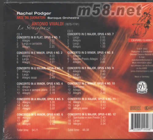 價格為估,以實到貨為準! VIVALDI維瓦爾迪小提琴(m58.net) 請點看產品正、背面大圖 MADE IN GERMANY 留聲機雜志獲獎小提琴家RACHEL PODGER與著名的巴洛克管弦樂團(ARTE DEL SUONATORI“演奏維瓦爾迪(VIVALDI)的非凡小提琴協奏曲集十二首。女小提琴家及樂團的演繹。不論技巧及感情的演繹都絕頂出色。更榮獲2003年留聲機雜志全年古典最佳錄音及演繹大獎,獲獎之選,不能錯過!