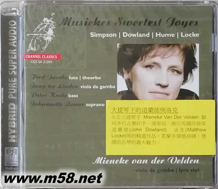 大提琴下的道蘭德與洛克 MUSICKES SWEETEST JOYES SACD(m58.net) 女古大提琴手 Mieneke Van Der Velden 聯同多位古樂好手,演奏如:兩位英國作曲家道蘭德(John Dowland)、洛克(Matthew Locke)等的精選作品。眾樂手情感演繹,發揮出古琴的最大魅力。 樂評精選 (International Record Review)國際錄音評論:韋丹雄渾的弓法,演奏出豐滿強勁的音符,配合積可斯的靈巧的魯特琴和高宜及森瑪的歌唱技巧,使道蘭德的兩首歌曲成為難得的版本。 (String Magazine)弦樂雜誌:韋丹優雅含蓄的技巧,完全表現出樂章的美態。 (Gramophone)留聲機雜誌:17世紀英國式的憂思和絕望由韋丹完美地演繹出來。