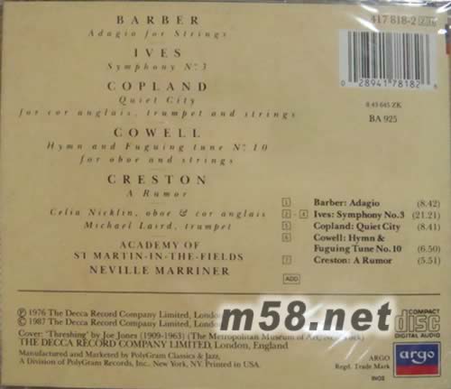 演奏科普蘭(在金黃的麥田上叉草)BARBER ADAGIO FOR STRINGS專輯背面圖片