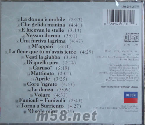 1. La donna e mobile 〔2:26〕 2. Che gelida manina 〔4:38〕 3. E lucevan le stelle 〔3:14〕 4. Nessun dorma! 〔2:57〕 5. Una furtiva lagrima 〔4:47〕 6. M’appari 〔3:31〕 7. La fleur que tu m’avais jetee 〔4:25〕 8. Vesti la giubba 〔3:37〕 9. Di quella pira 〔2:14〕 10. Caruso 〔5:19〕 11. Orchestral arrangement by Alexander Faris (1921-) 〔1:58〕 12. Orchestral arrangement by Alexander Faris (1921-) 〔3:22〕 13. Arr. Giancarlo Chiaramello (1939-) 〔4:55〕 14. La Danza 〔3:10〕 15. Arr. Henry Mancini (1924-1994) 〔4:35〕 16. Arr. Giancarlo Chiaramello (1939-) 〔2:45〕 17. Arr. Giancarlo Chiaramello (1939-) 〔4:27〕 18. Arr. Giancarlo Chiaramello (1939-) 〔3:25〕