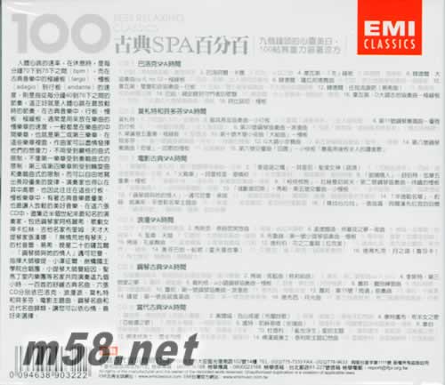 古典SPA百分百(m58.net) 人體心跳的速率,在休息時(shí),是每分鐘70下到75下之間(bpm),而在古典音樂(lè)中的極緩板(largo)、慢板(adagio)到行板(andante)的速度,則是指從每分鐘40到76下之間的節(jié)奏,這正好就是人體心跳在最放鬆時(shí)的節(jié)奏。在古典音樂(lè)中,行板、慢板、極緩板,通常是用來(lái)放在樂(lè)曲的慢樂(lè)章的速度,一般都是在樂(lè)曲的中間樂(lè)章,也就是第二或第三樂(lè)章。在這些樂(lè)章里面,作曲家可以盡情發(fā)揮他們的想像力,不用受到嚴(yán)格的曲式限制,不像第一樂(lè)章受到奏鳴曲式的限制、第三或第四樂(lè)章則受到輪旋曲和奏鳴曲式的限制,而可以自由地寫(xiě)出長(zhǎng)段優(yōu)美的旋律,演奏家也得以在其中高歌。也因此往往在這些行板、慢板樂(lè)章中,有著古典音樂(lè)最優(yōu)美、也最讓人放鬆的美好音樂(lè)。在這六張CD中,邀集近半個(gè)世紀(jì)來(lái)最知名的演奏家,包括鋼琴家阿格麗希、歌劇女神卡拉絲、吉他名家布里姆、天才大提琴家張漢娜、「無(wú)情荒地有琴天」的杜普蕾、易希、晚星二十的薩瓦爾、「鋼琴師與她的情人」邁可尼曼、指揮大師穆提、小澤征爾、劍橋國(guó)王學(xué)院合唱團(tuán)、小提琴大師曼紐因、圣馬丁室內(nèi)樂(lè)團(tuán)等名家共同演奏這九個(gè)小時(shí)、一百首的舒緩古典名曲。六張CD分別依巴洛克、浪漫派、莫札特和貝多芬、電影主題曲、鋼琴名曲和近代名曲歸類,讓您可以依心情、喜好來(lái)選擇。