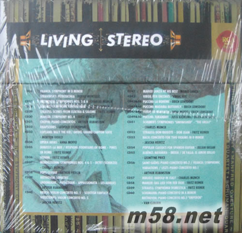 .Various Living Stereo Sampler 2.MUNCH, CHARLES/Saint-Saëns: Symphony No. 3; Debussy: La Mer; Ibert: Escales 3.MUNCH, CHARLES/Ravel: Daphnis et Chloé 4.REINER, FRITZ/ Strauss: Also sprach Zarathustra; Ein Heldenleben 5.REINER, FRITZ/Bartók: Concerto for Orchestra;Music for Strings, Percussion & Celesta; Hungarian Sketches 6.HEIFETZ, JASCHA /Beethoven: Violin Concerto; Mendelssohn: Violin Concerto 7.CLIBURN, VAN /Tchaikovsky: Piano Concerto No. 1; Rachmaninoff: Piano Concerto No. 2 8.FIEDLER, ARTHUR/Gershwin: Rhapsody in Blue; Concerto in F; An American in Paris; Variations on “I Got Rhythm” 9.REINER, FRITZ /Mussorgsky: Pictures at an Exhibition 10.PRICE, LEONTYNE/Leontyne Price: Arias 11.RUBINSTEIN, ARTHUR Chopin: Ballades & Scherzos 12.MONTEUX, PIERRE/Tchaikovsky: Symphony No. 6 “Pathétique” 13.GOULD, MORTON/Brass & Percussion 14.HEIFETZ, JASCHA/Sibelius, Prokofiev, Glazunov: Violin Concertos 15.MUNCH, CHARLES/Berlioz: Requiem 2CD 17.MUNCH, CHARLES/Ravel: Boléro; La Valse; Rapsodie espagnole; Debussy: Images for Orchestra 18.PIATIGORSKY, GREGOR/Dvorák; Walton: Cello Concertos 19.REINER, FRITZ/ Dvorák: New World Symphony 20.REINER, FRITZ/Rimsky-Korsakov: Scheherazade 21.RUBINSTEIN, ARTHUR /Brahms: Piano Concerto No. 1 22.FIEDLER, ARTHUR/ Offenbach: Gaïté parisienne 23.CLIBURN, VAN/Rachmaninoff: Piano Concerto No. 3; Prokofiev: Piano Concerto No. 3 24.FIEDLER, ARTHUR/Hi-Fi Fiedler 25.HEIFETZ, JASCHA/Brahms; Tchaikovsky: Violin Concertos 26.MONTEUX, PIERRE/Franck:Symphony in D Minor;Stravinsky: Petrouchka 27.MUNCH, CHARLES/Beethoven: Symphonies Nos. 5 & 6 28.MUNCH, CHARLES/Berlioz: Symphonie Fantastique; Love Scene From Romeo & Juliet 29.REINER, FRITZ/Strauss: Scenes from Elektra & Salome 30.REINER, FRITZ/ Mahler: Symphony No. 4 31.RUBINSTEIN, ARTHUR Chopin: Piano Concertos 32.STOKOWSKI, LEOPOLD/ Rhapsodies 33.GOULD, MORTON/Copland: Billy The Kid & Rodeo; Grofe: Grand Canyon Suite 34.MOFFO, ANNA/Arias from Faust; La Bohème; Dinorah; Carmen; Turandot; Semiramide; Lakmé 35.REINER, FRITZ/ Respighi: Pines Of Rome; Fountains Of Rome & Debussy: La Mer 36.REINER, FRITZ/Vienna 37.MUNCH, CHARLES/Mendelssohn: Symphonies Nos. 4 & 5; Octet: Scherzo 38.FIEDLER, ARTHUR/Pops Caviar 39.RUBINSTEIN, ARTHUR/Beethoven: Sonatas (Moonlight; Les Adieux; Pathetique; Appassionata) 40.HEIFETZ, JASCHA/Bruch: Violin Concerto No. 1; Scottish Fantasy & Vieuxtemps: Violin Concerto No. 5 41.LANZA, MARIO Mario! Lanza At His Best; Vagabond King Highlights 42.FOX, VIRGIL/ Encores 43.LEINSDORF, ERICH/Puccini: La Bohëme 2CD 45. LEINSDORF, ERICH/Puccini: Madama Butterfly 47.MOFFO, ANNA/Verdi: La Traviata 2CD 49.BJORLING, JUSSI/Puccini: Turandot 2CD 51.MUNCH, CHARLES/Schubert: Symphonies "The Great" & "Unfinished" 52.REINER, FRITZ/ Strauss: Don Quixote & Don Juan 53.HEIFETZ, JASCHA /Bach: Concerto for Two Violins in D Minor 54.BREAM, JULIAN/Popular Classics for Spanish Guitar 55.PRICE, LEONTYNE/Albeniz: Navarra, Iberia; Falla: El amor 56.RUBINSTEIN, ARTHUR/Saint-Saens: Piano Concerto No. 2; Franck: Symphonic Variations; Liszt: Piano Concerto No. 1 57.MUNCH, CHARLES/Berlioz: Harold In Italy; The Roman Carnival Overture; Benvenuto Cellini Overture; Le Corsaire Overture; Beatrice Et Benedict Overture 58.REINER, FRITZ/Mahler: Das Lied Von Der Erde 59.REINER, FRITZ/Strauss: Symphonia Domestica; Suite From Le Bourgeois Gentilhomme 60.CLIBURN, VAN/Schumann: Piano Concerto In A minor; Beethoven: Piano Concerto No. 5, Op. 73 "Emperor"