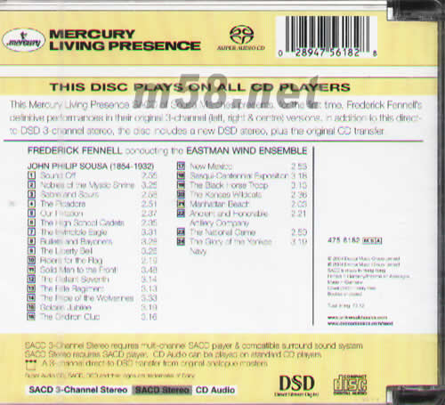 John Philip Sousa (1854-1932) 1. Sound Off 2. Nobles of the Mystic Shrine 3. Sabre and Spurs 4. The Picadore 5. Our Flirtation 6. The High School Cadets 7. The Invincible Eagle 8. Bullets and Bayonets 9. The Liberty Bell 10. Riders for the Flag 11. Solid Men to the Front! 12. The Gallant Seventh 13. The Rifle Regiment 14. The Pride of the Wolverines 15. Golden Jubilee 16. The Gridiron Club 17. New Mexicov 18. Sesqui-Centennial Exposition 19. The Black Horse Troop 20. The Kansas Wildcats 21. Manhattan Beach 22. Ancient and Honorable Artillery Company 23. The National Game 24. The Glory of the Yankee Navy