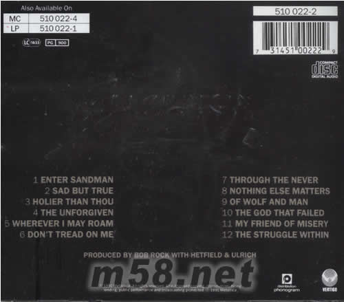 同名專輯(m58.net) 搖滾帝王“金屬制品Metallica”,以全球8千5百萬張的專輯銷售量,高居全美SoundScan唱片史上銷售總排名TOP5,出道以來發行一首又一首、撼動全美主流搖滾榜的經典