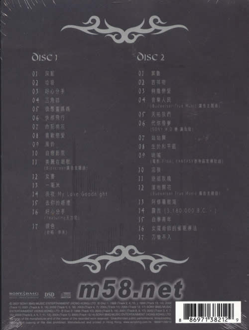 CD 1 1.深藍(lán) 2.垃圾 3.好心分手 4.三角志 5.很想當(dāng)媽媽 6.快感飛行 7.命犯桃花 8.喜歡戀愛 9.風(fēng)鈴 10.自戀影院 11.美麗在唱歌(BIOSCREEN廣告主題曲) 12.女書 13.一毫米 14.長夜 MY LOVE GOODNINGHT 15.去你的婚禮 16.好心分手(FEATURING王力宏) 17.眼色 CD 2 1.算數(shù) 2.吉祥物 3.夠膽談戀愛 4.音樂人民(BUDWEISER TRUE MUSIC廣告主題曲) 5.天佑我們 6.代你發(fā)夢(SONY M.D.機(jī) 廣告歌) 7.站站舞 8.生于和平區(qū) 9.吶喊(電影FINAL FANTASY香港區(qū)宣傳歌曲) 10.沮喪 11.逆插玫瑰 12.落地開花(BUDWEISER TRUE MUSIC廣告主題曲) 13.阿修羅樹海 14.露西(3.180.000 B.C) 15.自學(xué)青年 16.女魔術(shù)師的催眠療法 17.刀槍不入