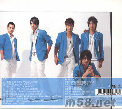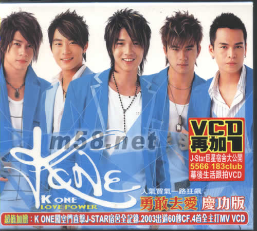 VCD 1 K ONE闖空門直擊J-Star宿舍全紀錄 2 2003出道60秒猛爆CF 3 勇敢去愛、最愛是你、Seasons in the sun、First Love 4 首MV CD 01. 勇敢去愛 Love Power 02. 冠軍 Champion 03. 頂尖高手 Top Gun 04. 公主陛下 My Princess 05. 最愛是你 I Love U the Most 06. 繞圈圈 Spinning in Circle 07. 失戀寵物救援行動 Unwanted Pet's Rescue 08. Seasons in the Sun 09. 最美的一刻 The Most Precious Moment 10. First Love