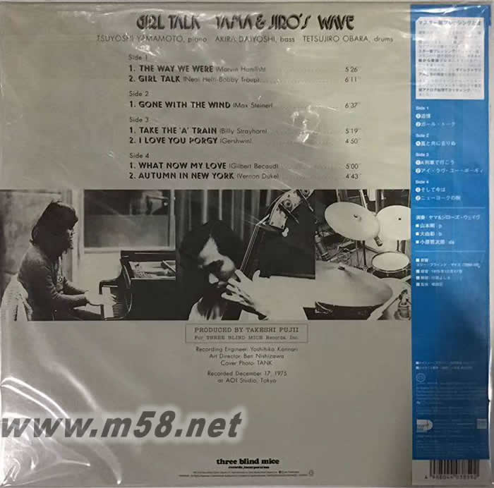 Girl Talk 三盲鼠 爵士鋼琴三重奏 (鋼琴、貝斯、鼓) 180g 45RPM LP 雙黑膠(m58.net) TSUYOSHI YAMAMOTO 鋼琴 ISOO FUKUI BASS貝斯 TETSUJIRO OBARA 爵士鼓 這張名為「Girl Talk」的專輯就如它的名稱一樣,七首歌曲都是這種美得無法自拔的慢板,擔任鋼琴的隊長山本剛對於這些音樂有它非常獨到的見解,你會發覺到音樂中的頹靡味變成灑脫的效果,加上他一貫華麗的觸鍵,讓這些曲子成為最耐聽的小品。 曲子中除了第一首「追憶」最為人稱道之外,「亂世佳人」、「I love You,Porgy」也是經常演出的曲子之一,1975年錄音時,當時這三位演奏家都還是爵士新鮮人,不過從音樂中你完全聽不出任何生疏之感。樂器定位明確清晰,鋼琴顆粒逼真的優秀錄音。