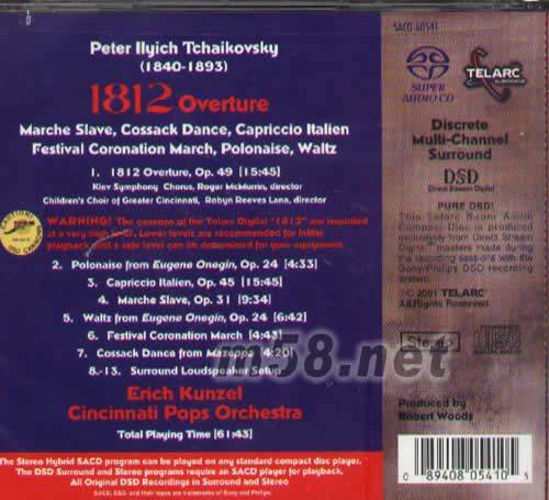 Peter Ilyich Tchaikovsky (1840-1893) 1812 Overture Marche Slave,Cossack Dance,Capriccio Italien Festival Coronation March,Polonaise,Waltz 01. 1812 Overture,Op.49 [15:45] Kiev Symphony Chorus,Roger McMurrin,director Children's Choir of Greater Cincinnati,Robyn Reeves Lana,director WARNING!The cannons of the Telarc Digital "1812" are recorded at a very high level.Lower levels are recommended for initial playback until a safe level can be determined for your equipment. 02. Polonaise from Eugene Onegin,Op.24 [4:33] 03. Capriccio Italien,Op.45 [15:45] 04. Marche Slave,Op.31 [9:34] 05. Waltz from Eugene Onegin,Op.24 [6:42] 06. Festival Coronation March [4:43] 07. Cossack Dance from Mazeppa [4:20] 8-13.SURROUND LOUDSPEAKER SETUP Erich Kunzel Cincinnati Pops Orchestra