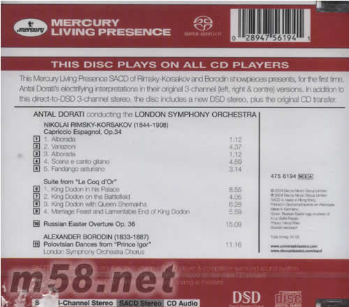 NIKOLAI RIMSKY-KORSAKOV(1884-1908) Capriccio Espagnol,Op34 1 Alborada 2 Variazioni 3 Alborada 4 Scena e canto gitano 5 Fandango asturiano Suite from“Le Coq d'Or” 6 King Dondon in his Palace 7 King Dondon on the Battlefield 8 King Dondon with Queen Shemakha 9 Marriage Feast and Lamentable End of King Dondon 10 Russian Easter Overture Op.36 ALEXANDER BORODIN(1833-1887) 11 Polovtsian Dances form“Prince lgor” London Symphony Orchestra Chorus