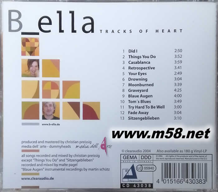 TRACKS OF HEART(m58.net) 德國的 B_ella男女二人組合,由女主音 Sabine Bickel與結他手 Paul Martin組成,樂風令人想起當年的 Frente!德國Clearaudio唱片公司收歸旗下,并為其推出發燒專輯《 Tracks of Heart》. 全碟伴奏僅為吉它,偶有男聲伴唱,錄音極為精準、干凈,音質極為HI-FI。優美略帶憂郁的北歐鄉村歌調,技驚四座,現場感、空間感十足。