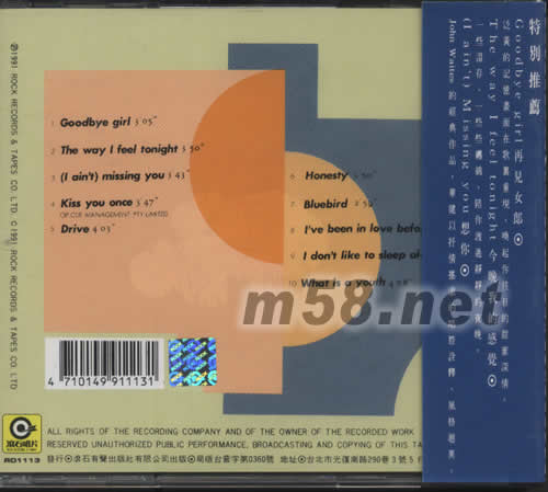 01 Goodbye girl 02 The way I feel tonight 03 (I ain't)Missing You 04 Kiss you once 05 Drive 06 Honesty 07 Bluebird 08 I've Been in Love Before 09 I don't like to sleep alone 10 What is a youth