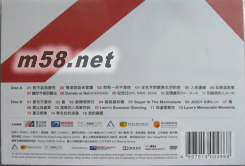 DVD 1 01. 對不起我愛你 02. 情深說話未曾講 03. 那有一天不想你 04. 沒名字的歌無名字的你 05. 人在邊緣 06. 如果這是情 07. 愿你今夜別離去 08. Donate or Not(每場精選輯錄) 09. 紀念日(黎明 陳慧琳 雷頌德) 10. 友情歲月(黎明 陳小春) 11. 別碰我的人(陳小春) DVD 2 01. 愛你不愛你 02. 喜 03. 眼睛想旅行 04. 越夜越有機 05. Sugar In The Marmalade 06. JUICY GIRL(JW) 07. 情 08. 愛比我重要 09. 孤單的人孤單的我 10. Leon's Seasonal Greeting 11. 我這樣愛你 12. Leon's Memorable Moments 13. 夏日傾情 14. 無名份的浪漫 15. 我的親愛