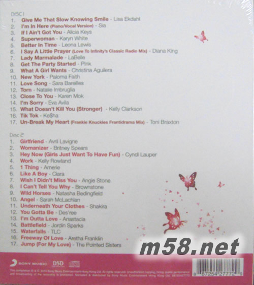 Disc 1 1 Give Me That Slow Knowing Smile(給我一個會心的微笑) - Lisa Ekdahl 2 I'm In Here (Piano/Vocal Version) (我在這里) - Sia 3 If I Ain't Got You(如果我沒有了你) - Alicia Keys 4 Superwoman(女超人) - Karyn White 5 Better In Time(好好的過) - Leona Lewis 6 I Say A Little Prayer (Love To Infinity's Classic Radio Mix) (我輕輕地祈禱) - Diana King 7 Get The Party Started(讓舞會開始) - P!nk 8 What A Girl Wants(一個女孩想要的) - Christina Aguilera 9 New York (Radio Edit) (紐約) - Paloma Faith 10 Love Song (Album Version) (愛之歌)- Sara Bareilles 11 Torn (心碎)- Natalie Imbruglia 12 Close To You (Album Version) (靠近你) - Karen Mok 13 I'm Sorry (對不起)- Eva Avila 14 Stronger (What Doesn't Kill You) (堅定不移)- Kelly Clarkson 15 TiK ToK(踢踏) - Ke$ha 16 Un-Break My Heart (Frankie Knuckles Franktidrama Club Mix) (撫平我的心 混音版)- Toni Braxton Disc 2 1 Girlfriend (Radio Edit) (女朋友) - Avril Lavigne 2 Womanizer (Main Version) (好色之徒) - Britney Spears 3 HEY NOW (GIRLS JUST WANT TO HAVE FUN) (嘿 就是現在)- Cyndi Lauper 4 Work (Freemasons Radio Edit) (干活)- Kelly Rowland 5 1 Thing(一件事情) - Amerie 6 Like A Boy (Main Version) (像男孩那樣) - Ciara 7 Wish I Didn't Miss You (Album Version) (希望我不會想你) - Angie Stone 8 I Can't Tell You Why (Album Version) (我無法告訴你為什么)- Brownstone 9 Wild Horses (野馬)- Natasha Bedingfield 10 Angel (天使)- Sarah McLachlan 11 Underneath Your Clothes (Album Version) (衣裝之下) - Shakira 12 You Gotta Be (Album Version) (你必須)- Des'ree 13 I'm Outta Love (Album Version) (遠離愛)- Anastacia 14 Battlefield(戰場) - Jordin Sparks 15 Waterfalls (瀑布)- TLC 16 Freeway Of Love (自由戀愛)- Aretha Franklin 17 Jump (For My Love) (跳起來)- The Pointer Sisters