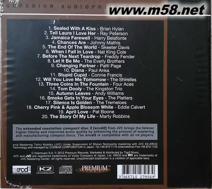爵士紅伶 BEST AUDIOPHILE OLDIES XRCD(m58.net) 由JVC獨家開發的XRCD,是經由JVC研發的K2雷射定位錄音技術,重新製作母帶。JVC獨家開發的K2超級數字編碼器,可消除極大的低電頻信號的諧 波失真,減少系統運行時不純淨的交流電對數碼的雜波干擾,這樣技術使得原音得以忠實重現。XRCD全部按照16bit / 44.1KH2的CD標準製作,所以不需要特殊的CD唱盤或譯碼器就能明顯展現出與眾不同的優越性。原裝母帶採用JVC超解析技術處理,日本製造。 原音原唱版。這張專輯由出版爵士女伶的新加坡唱片公司,再次和木內和夫合作發行XRCD版原音原唱的西洋老歌。專輯收錄了世界知名巨星所唱的動人懷舊歌曲,木內先生的巧手,再次讓經典老歌原音重現,經典無限。