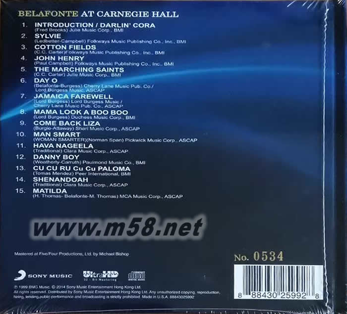 BELAFONTE AT CARNEGIE HALL 貝拉芬堤在卡耐基大廳 ULTRAHD 限量版(m58.net) 在上世紀五、六十年代開始,他是美國流行音樂史上與貓王齊名的偉大黑人歌手,是真正的黑人民族音樂發揚者,他以摻雜西印度群島加利帕騷(galypso)風格的演唱特色而傾倒眾生。與貓王的英年早逝相對比,BELAFONTE可說是株長青樹,他德高望重,健康長壽。熱心公益事業,本張專輯的絕靚現場演出,就是為做慈善。技佳,德美,傾倒眾生。幾十年來,一直是美國發燒界的模子。 他的嗓音中氣十足,嘹亮渾厚,肺活量大得驚人,嘖嘖,就憑這樣的底氣,不服不行。他既擅長古典,也擅長爵士,絕對發燒的一把好嗓!值得收藏!