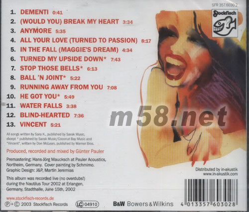 ARE WE THERE YET LIVE IN CONCERT(m58.net) 發燒碟天后Sara.k(莎拉·K)與結他好手Chris Jones 在2002年于德國一場充滿人聲、結他聲及掌聲的演唱會實況錄音CD,是現聲Acoustic(原音)效果至尊示范之作!