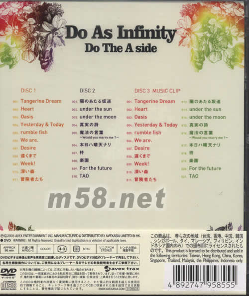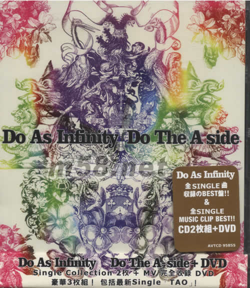 價格為估,以實到貨為準! DO THE A SIDE(無限完美 A面精選)(海外版)(m58.net) 大無限樂團解散紀念精選 [無限完美 A面精選] 全SINGLE MUSIC CLIP BEST CD2枚組+DVD 1999年9月29日以單曲「Tangerine Dream 橙色的夢」出道的大無限樂團,選擇在出道屆滿6周年的這一天開始各奔前程。回顧這6年來,大無限樂團不僅在日本歌壇表現亮眼,與臺灣歌迷更是交流頻繁。而在這張雙CD+DVD的豪華精選輯「無限完美 A面精選」中,完整收錄了大無限樂團從出道到解散這6年間所推出的全部20張單曲21首主打歌曲,DVD中也一首不漏地收錄了這21首作品的音樂錄像帶。所有作品依出版時序收錄,一次回顧這6年間大無限樂團的成長軌跡以及帶給我們的回憶感動!